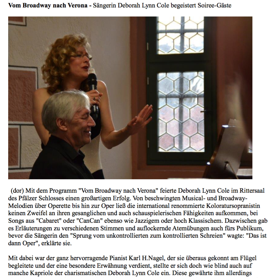 Die amerikanische Sporanistin Deborah Cole trifft den Jazzpianisten Karl H. Nagel. Gemeinsam präsentieren sie ihre eigenen, spannenden Interpretationen von Stücken von George Gershwin, Kurt Weill bis hin zu Chick Corea. Besonderen Wert legen die beiden Musiker daneben aber auch auf die Vorstellung von weniger bekannten Komponisten. Dazu gehört Frank Sinatras Gitarrist Ron Anthony, der - nebenbei bemerkt - die Noten seiner Stücke Deborah persönlich überreicht hat.
